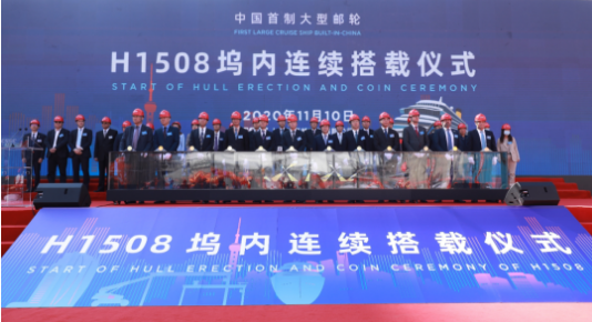 大型郵輪工程是中國船舶集團貫徹習近平總書記重要指示精神、落實國家戰(zhàn)略、滿足人民美好生活需要的重大舉措,也是中國船舶集團強化科技創(chuàng)新、促進轉型升級、推動高質(zhì)量發(fā)展的一號工程。2018年11月6日,中國船舶集團與美國嘉年華集團、意大利芬坎蒂尼集團在首屆中國國際進口博覽會上正式簽訂2+4艘13.5萬總噸Vista級大型郵輪建造合同,并舉行了中國船舶集團大型郵輪項目工程正式啟動儀式。這是我國首次簽訂真正意義上的大型郵輪建造合同,開啟了中國船舶工業(yè)建造大型郵輪的新時代。2019年10月18日,中國首制大型郵輪在外高橋造船正式開工點火進行鋼板切割,全面進入實質(zhì)性建造階段。一年多來,在中國船舶集團的堅強領導下,在中船郵輪科技發(fā)展有限公司、中船第九設計研究院工程有限公司、上海船舶工藝研究所等兄弟單位的大力支持下,外高橋造船經(jīng)受住了新冠肺炎疫情的洗禮和考驗,克服了物資采購、薄板車間流水線建設滯后等一系列困難,一步一個腳印,如期實現(xiàn)了塢內(nèi)連續(xù)搭載總裝的里程碑節(jié)點。