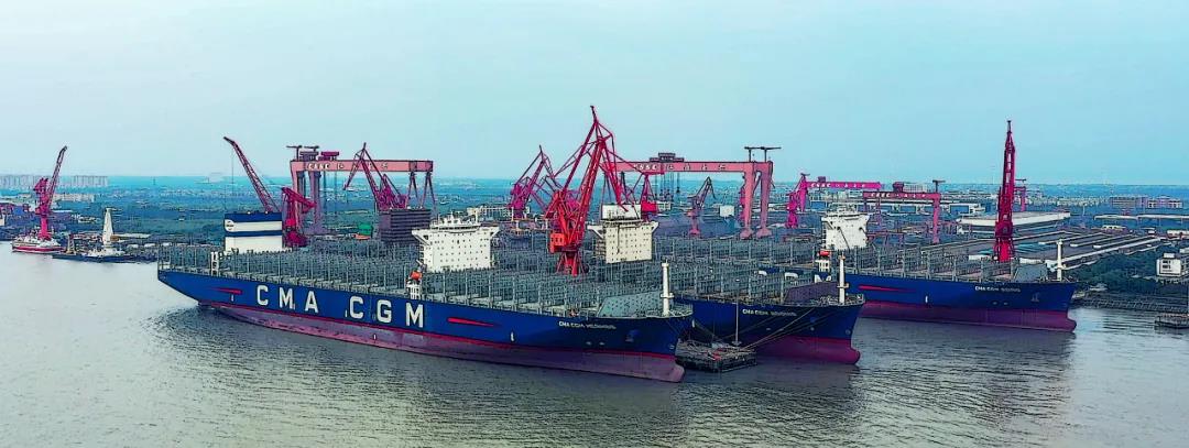 “海上綠巨人”系列箱船是滬東中華近期的重點(diǎn)產(chǎn)品。三艘15000TEU集裝箱船列隊(duì)整齊,滬東中華建造團(tuán)隊(duì)開足馬力,奮戰(zhàn)金秋。該型號集裝箱船是當(dāng)今世界綠色環(huán)保船型,國產(chǎn)化率達(dá)到90%,可靈活布置于全球各個(gè)重要航線。