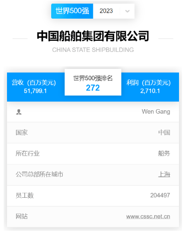 北京時(shí)間2023年8月2日,《財(cái)富》中英文網(wǎng)站同時(shí)發(fā)布2023《財(cái)富》世界500強(qiáng)排行榜,中國船舶集團(tuán)有限公司以517.991億美元的營業(yè)收入位列全球榜單第272位,自2021年重組后首次申報(bào)以來連續(xù)三年上榜,蟬聯(lián)全球造船企業(yè)首位。