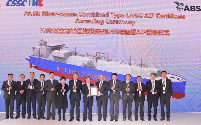 ????中國(guó)船舶集團(tuán)所屬滬東中華造船(集團(tuán))有限公司推出了包括LNG-FSRU船、ARC7破冰型LNG船、350MV LNG發(fā)電船、V2.0版18600立方米LNG加注船在內(nèi)的6款新船為中國(guó)船舶集團(tuán)代言。12月4日,滬東中華獲得了由美國(guó)船級(jí)社頒發(fā)的全球首例7.99萬(wàn)立方米江海聯(lián)運(yùn)型LNG船AiP證書、由DNV GL船級(jí)社頒發(fā)的全球最大25000TEU集裝箱船AiP證書。