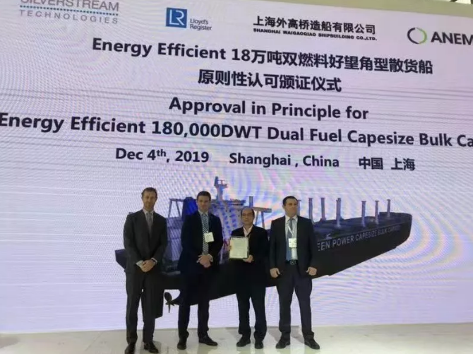 ????12月4日,中國(guó)船舶集團(tuán)所屬上海外高橋造船有限公司隆重推出兩款集多種節(jié)能環(huán)保技術(shù)于一身的“Energy Efficient”18萬(wàn)噸級(jí)雙燃料好望角型散貨船和30萬(wàn)噸級(jí)雙燃料超大型原油船新船型。展會(huì)上,英國(guó)勞氏船級(jí)社為18萬(wàn)噸級(jí)雙燃料好望角型散貨船頒發(fā)了AiP證書;英國(guó)勞氏船級(jí)社和美國(guó)船級(jí)社為30萬(wàn)噸級(jí)雙燃料超大型原油船頒發(fā)了AiP證書。