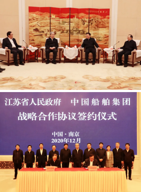 12月21日,中國(guó)船舶集團(tuán)有限公司與江蘇省人民政府在南京簽署戰(zhàn)略合作協(xié)議。中國(guó)船舶集團(tuán)黨組書(shū)記、董事長(zhǎng)雷凡培,黨組副書(shū)記、總經(jīng)理?xiàng)罱鸪?,黨組成員、副總經(jīng)理錢建平、杜剛,江蘇省委書(shū)記、省人大常委會(huì)主任婁勤儉,省委副書(shū)記、省長(zhǎng)吳政隆,省委常委、省委秘書(shū)長(zhǎng)郭元強(qiáng),副省長(zhǎng)馬秋林,省政府秘書(shū)長(zhǎng)陳建剛等領(lǐng)導(dǎo)出席簽約儀式。楊金成、馬秋林分別代表雙方在協(xié)議上簽字。簽約前,雙方圍繞共同服務(wù)國(guó)家戰(zhàn)略,就進(jìn)一步加強(qiáng)交流合作、實(shí)現(xiàn)共同發(fā)展進(jìn)行深入交流并達(dá)成共識(shí)。
