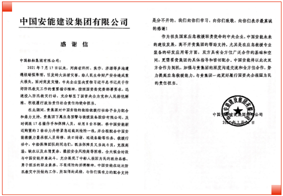近日,擔負國家應(yīng)急救援職責使命的中國安能建設(shè)集團有限公司發(fā)來一封感謝信。