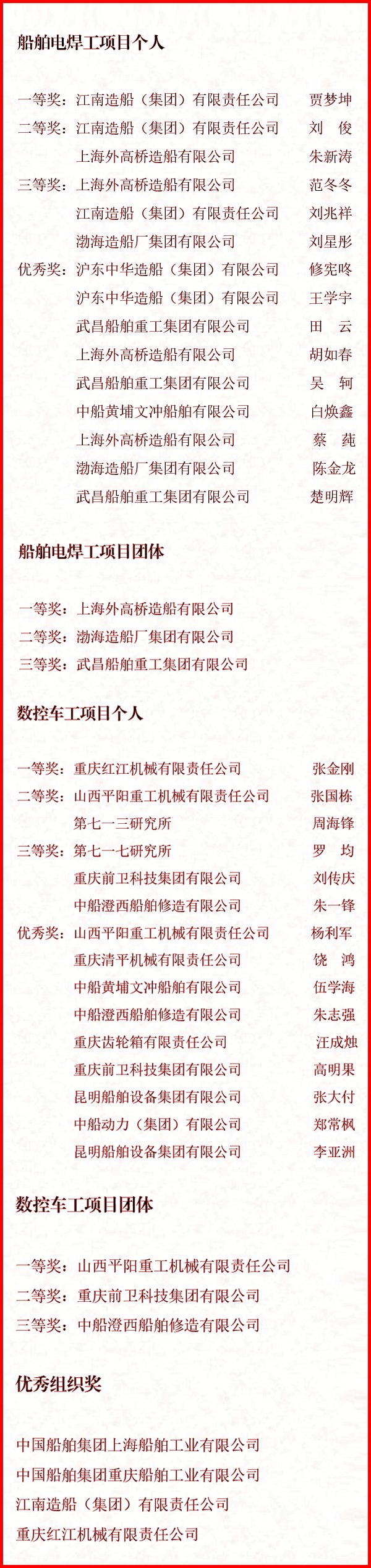 9月27日至9月30日,中國(guó)船舶集團(tuán)有限公司聯(lián)合中國(guó)就業(yè)培訓(xùn)技術(shù)指導(dǎo)中心,在上海、重慶兩地成功舉辦了國(guó)家二類競(jìng)賽——“2021年全國(guó)行業(yè)職業(yè)技能競(jìng)賽—中國(guó)船舶集團(tuán)有限公司職業(yè)技能競(jìng)賽”。來(lái)自49家成員單位共計(jì)128名選手同臺(tái)角逐,最終評(píng)選出個(gè)人及團(tuán)體一、二、三等獎(jiǎng)和個(gè)人優(yōu)秀獎(jiǎng),優(yōu)秀組織獎(jiǎng)等獎(jiǎng)項(xiàng)。