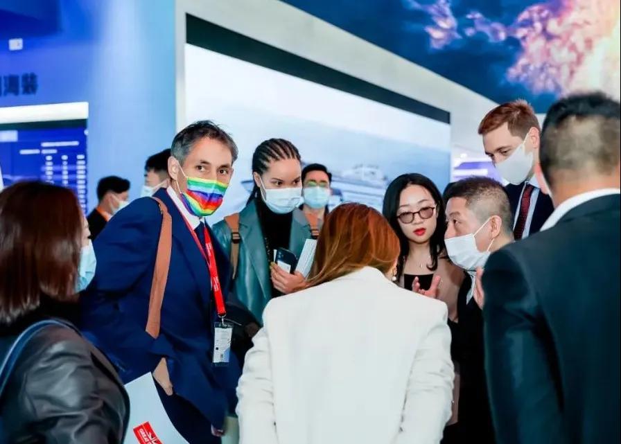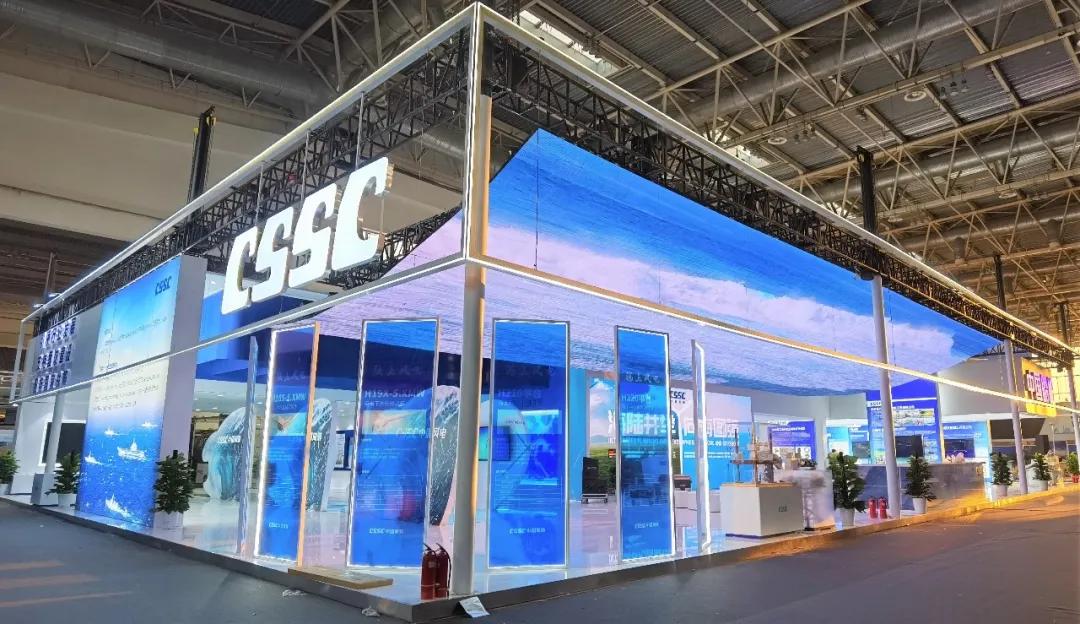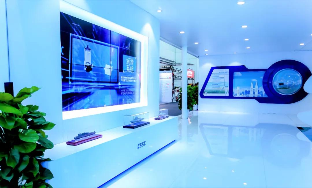 中國船舶集團(tuán)展臺摒棄了“傳統(tǒng)色彩矩陣”,用“深海藍(lán)”加 “風(fēng)機(jī)白”打造出大氣磅礴的開合式復(fù)合空間域,細(xì)節(jié)上則采用生態(tài)為先、大道至簡、科技為尚三大設(shè)計語言,將“風(fēng)傳送”“海推動”“碳排放”業(yè)務(wù)生態(tài)鏈條進(jìn)行了全方位的解構(gòu),吸引了眾多觀展人士駐足。