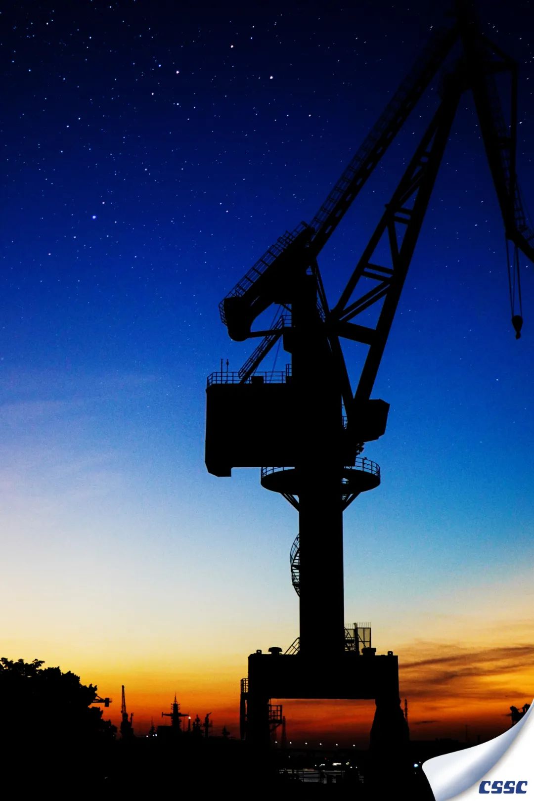 雖與巨輪不同,但船舶生產(chǎn)場(chǎng)地的起重器械亦可稱大國(guó)重器。此圖拍攝于2022年2月11日黃埔文沖,恰逢黃昏與星夜交替,器械與船舶共舞。舉起相機(jī)對(duì)著夕陽,記錄下這美好的時(shí)刻,以剪影的形式表現(xiàn)工作中的船舶風(fēng)景。