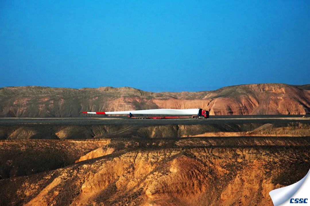 虎年開年, 中國(guó)海裝首臺(tái)H155-5MW機(jī)組在百里風(fēng)區(qū)——新疆哈密成功完成吊裝,該機(jī)組是新疆哈密目前單機(jī)容量最大的風(fēng)電機(jī)組。圖為超大型風(fēng)葉運(yùn)輸過程的縮影。