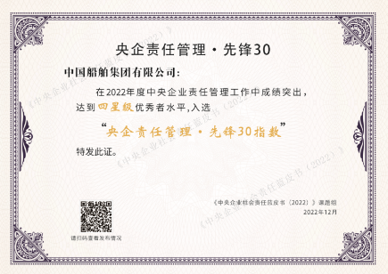 中國船舶集團(tuán)一直堅持加強(qiáng)社會責(zé)任工作管理,將責(zé)任理念貫穿于企業(yè)科研生產(chǎn)經(jīng)營和改革發(fā)展全過程、各方面,積極履行船舶軍工央企聚力興裝強(qiáng)軍、矢志興船報國、勇攀科技高峰、踐行綠色發(fā)展、助力鄉(xiāng)村振興等各方面責(zé)任,同時還大力開展責(zé)任溝通,積極對外展示履責(zé)成效及形象。此次入選“央企責(zé)任管理 · 先鋒30指數(shù)”,體現(xiàn)了上級機(jī)關(guān)和社會各界對中國船舶集團(tuán)社會責(zé)任工作的認(rèn)可和肯定。