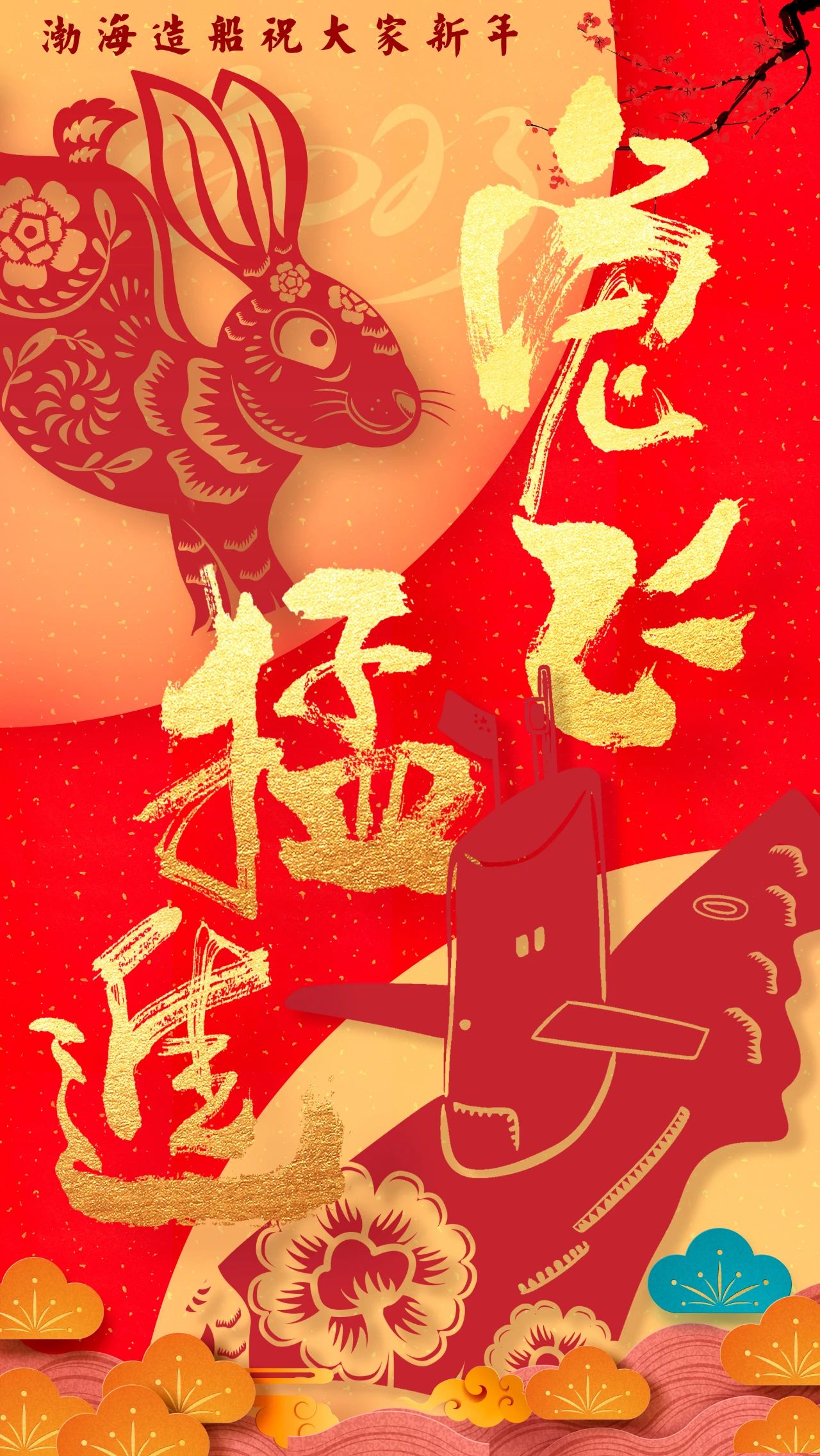 渤海造船的拜年海報(bào)以紅色背景為基礎(chǔ),奠定喜慶祥和的節(jié)日氛圍,畫面主體采用中國傳統(tǒng)民間剪紙藝術(shù),將飛騰的瑞兔與破浪的國之重器有機(jī)結(jié)合,讓我們2023年突飛猛進(jìn),大展宏圖!