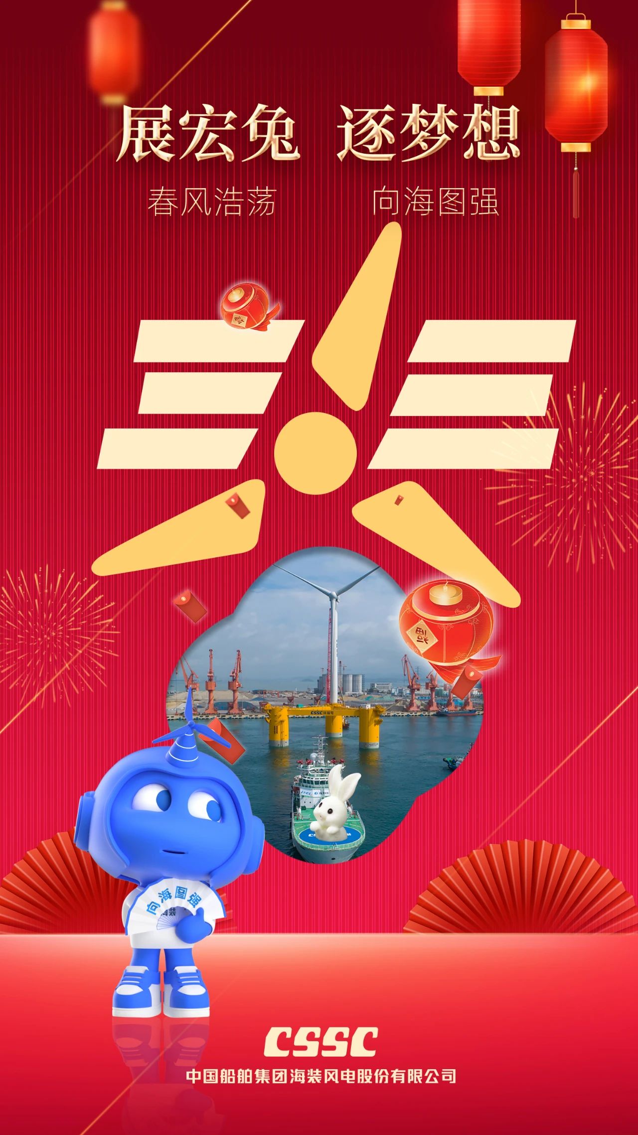 海報(bào)主體部分以國內(nèi)首臺(tái)深遠(yuǎn)海浮式風(fēng)電裝備“扶搖號(hào)”為創(chuàng)意點(diǎn),通過含有“大風(fēng)車”形象的寫意“春”字,表達(dá)中船海裝將在春風(fēng)浩蕩中大展宏“兔”,在向海圖強(qiáng)征程中矢志奮斗!
