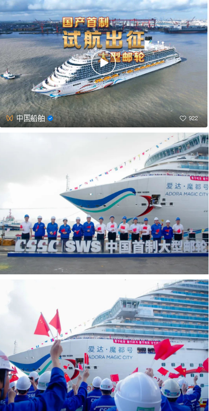 自2019年10月首艘國產(chǎn)大型郵輪開工建造以來,中國船舶集團及相關(guān)成員單位深入貫徹落實習近平總書記重要指示批示精神和黨中央決策部署,通過引進消化和自主創(chuàng)新,相繼開展了郵輪設計、建造、項目管理等專項攻關(guān),項目工程穩(wěn)步推進,各項節(jié)點順利完成,一系列科技創(chuàng)新成果落地開花。預計首制船將于今年底完工交付。