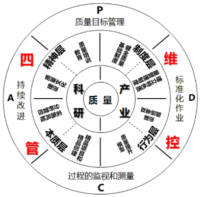 七二五所結(jié)合自身軍工科研和科技產(chǎn)業(yè)“一所兩制”的特點(diǎn),凝練形成了一套目標(biāo)明確(P)、標(biāo)準(zhǔn)作業(yè)(D)、監(jiān)管有效(C)、螺旋上升持續(xù)改進(jìn)(A)的“四維”質(zhì)量管理模式。該模式沿著精神層、制度層、行為層和本質(zhì)層四個(gè)維度實(shí)施質(zhì)量建設(shè)和管控。精神層是“核心”層,體現(xiàn)了七二五所人對(duì)質(zhì)量?jī)r(jià)值的精神追求,通過(guò)質(zhì)量文化創(chuàng)建、內(nèi)外部宣傳教育來(lái)牢固樹(shù)立四維質(zhì)量管理的理念。制度層是“法制”層,以制度形式規(guī)范質(zhì)量行為、工藝標(biāo)準(zhǔn)。建立覆蓋四大板塊的多行業(yè)立體式管理體系,形成47個(gè)特色制度,保障四維質(zhì)量管理模式的有效實(shí)施。行為層是“實(shí)施”層,通過(guò)質(zhì)量提升模型和雙零班組建設(shè)開(kāi)展實(shí)施,反映了七二五所人對(duì)質(zhì)量文化精神維度的理解和對(duì)制度維度的遵守。本質(zhì)層是“目的”層,是四維質(zhì)量管理輸出的目標(biāo)產(chǎn)物,反映了產(chǎn)品、服務(wù)的本質(zhì)質(zhì)量。