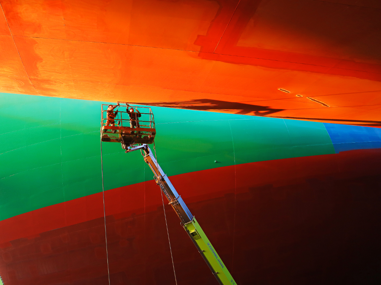 兩位打磨工人駕駛高空車(chē)對(duì)外板進(jìn)行清潔施工,這個(gè)瞬間,他們?nèi)缤蒙碛谕?huà)當(dāng)于一般。