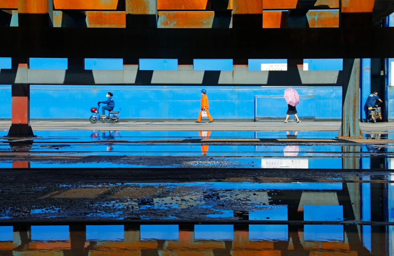 夏日清晨,一場(chǎng)大雨過(guò)后空氣透亮清新,廠(chǎng)區(qū)高跨門(mén)口服裝各異的職工行走在上班的路上,空地上擺放的工裝架與其自身的投影形成了獨(dú)特的畫(huà)框,讓畫(huà)面中行走的職工雖小卻很突出,起重工亮橙色的服裝、撐起的雨傘與明亮的藍(lán)色跨門(mén)形成色彩對(duì)比,使畫(huà)面活潑跳躍,職工們形形色色又從容有序,勾勒出廠(chǎng)區(qū)一隅的美麗風(fēng)景。