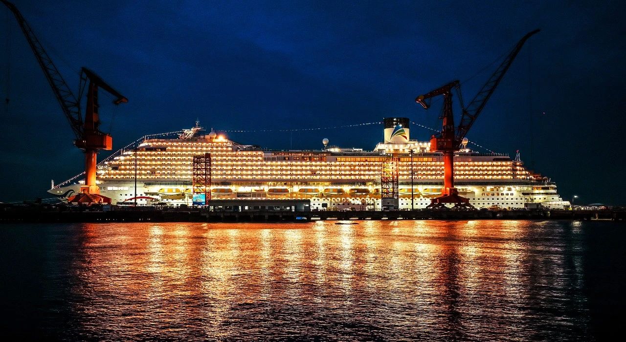 國(guó)產(chǎn)首艘國(guó)產(chǎn)大型郵輪“愛(ài)達(dá)·魔都號(hào)”,停靠在長(zhǎng)江口,燈光電路測(cè)試期間,華燈綻放恍如白晝。