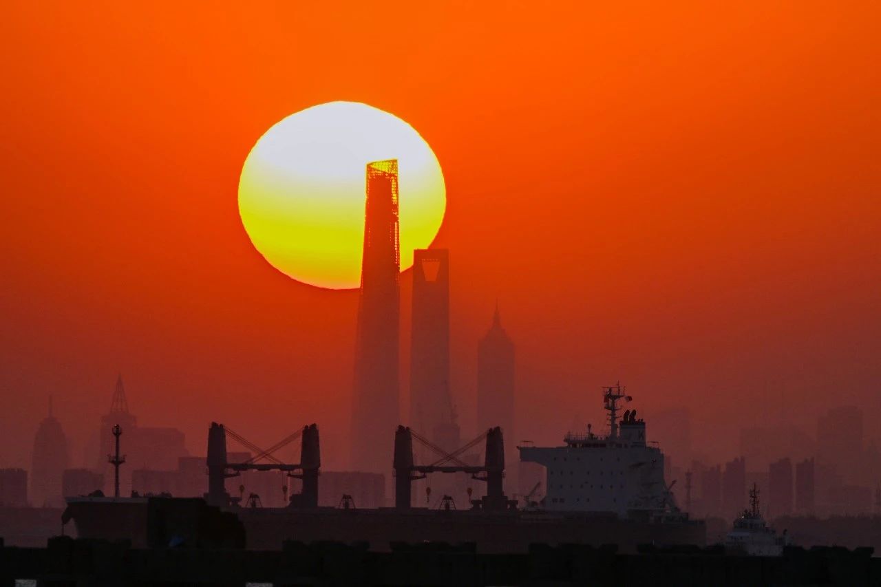 從距離陸家嘴33公里遠(yuǎn)的橫沙島上遠(yuǎn)眺“三件套”,夕陽(yáng)從“三件套”穿過(guò),此時(shí)一艘船駛?cè)氘?huà)面,與夕陽(yáng)形成近中遠(yuǎn)三景。