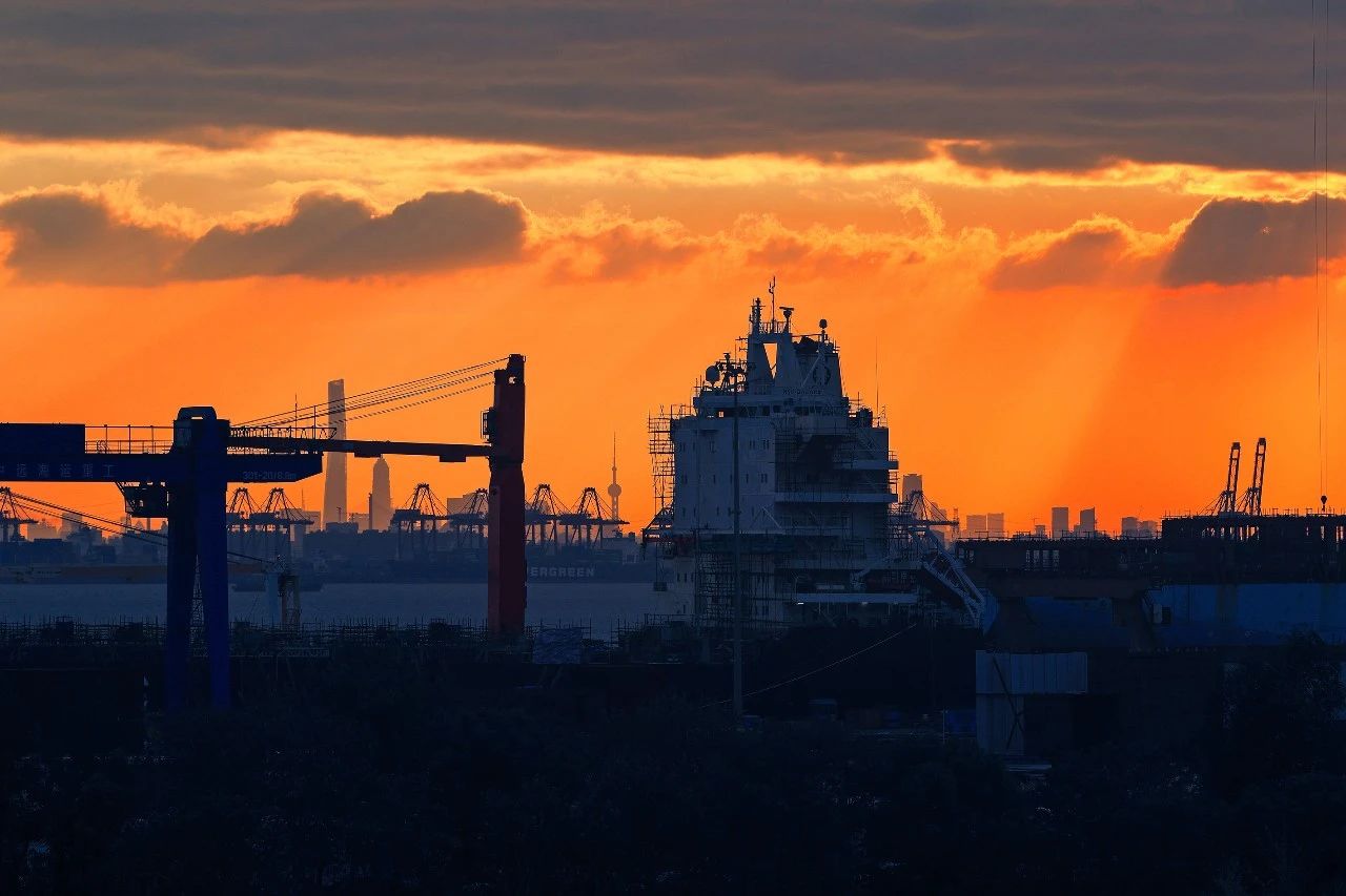 落日余暉下,造船現(xiàn)場(chǎng)燈火通明,展現(xiàn)出一派繁忙景象。在五彩斑斕的晚霞襯托下,整個(gè)造船基地猶如寶石般熠熠生輝。