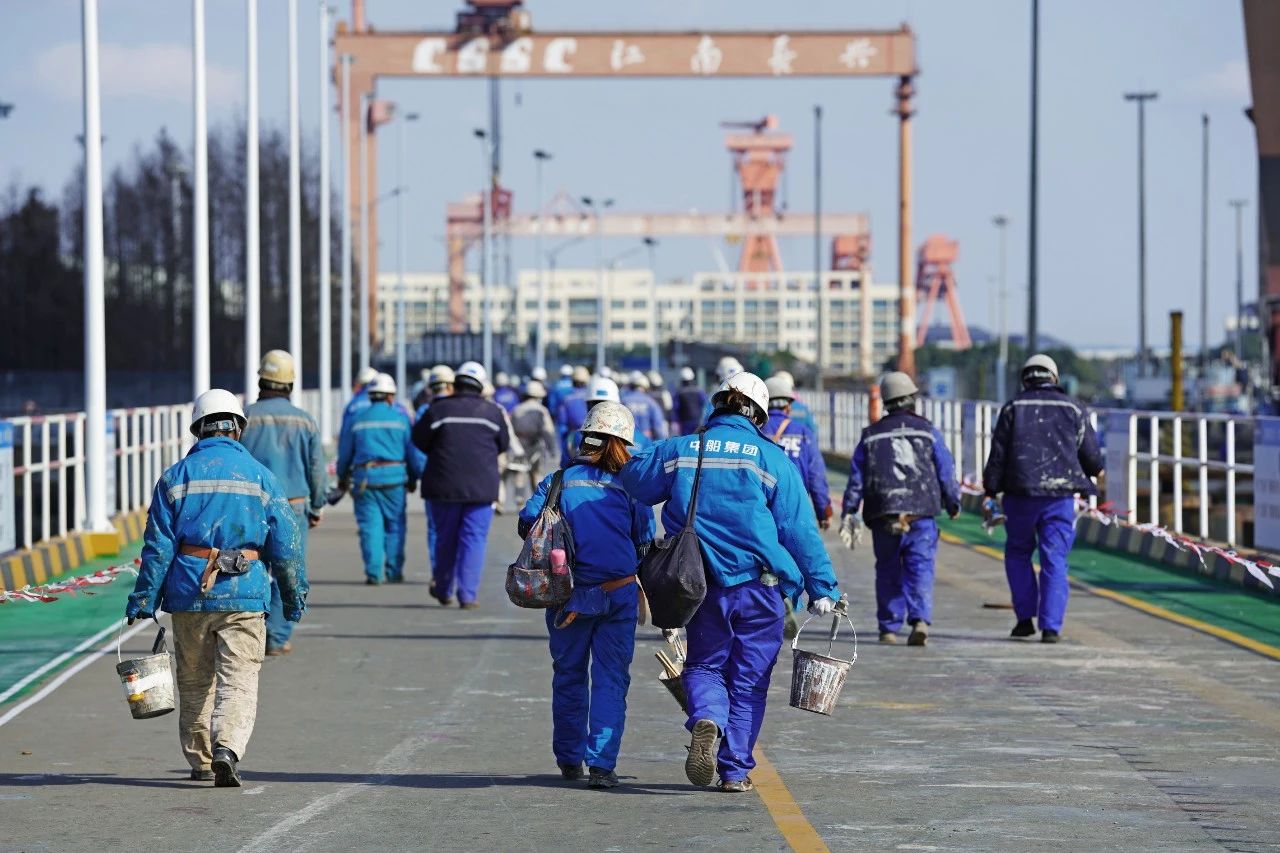 在碼頭上,午休時(shí)間,一線(xiàn)工人拎著工作工具,互相交談著,亦或是搭著肩膀,一起下班。