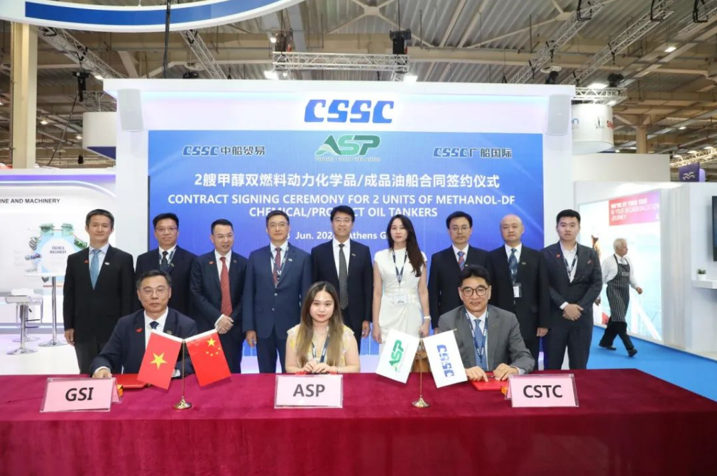 中船貿(mào)易、廣船國(guó)際與ASP公司2艘5萬(wàn)噸MR甲醇雙燃料油輪項(xiàng)目簽約儀式