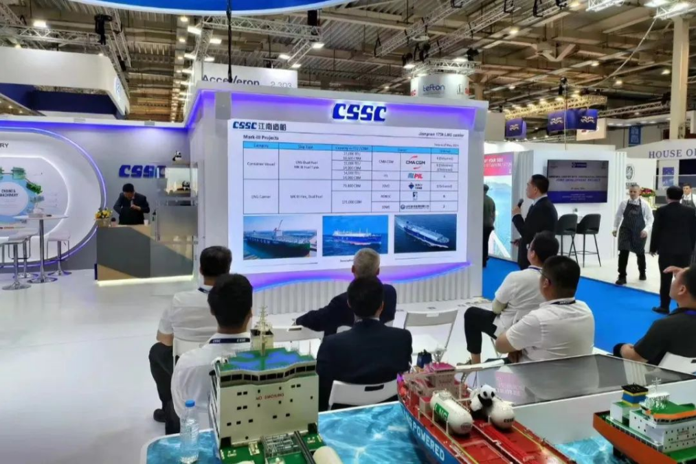 此次展會(huì),中國(guó)船舶集團(tuán)攜旗下19家成員單位參展,有關(guān)成員單位負(fù)責(zé)人率隊(duì)赴展會(huì)開展重點(diǎn)船海項(xiàng)目經(jīng)營(yíng)洽談并拜訪當(dāng)?shù)睾椭苓厙?guó)家客戶。集團(tuán)公司以“共贏未來(lái)”為參展主題,設(shè)置集團(tuán)總體區(qū)、綠色航運(yùn)解決方案區(qū)、低碳環(huán)保配套設(shè)備區(qū)共3個(gè)展示區(qū)域,重點(diǎn)展示了135500總噸大型郵輪、175000方LNG運(yùn)輸船、24000箱超大型集裝箱船、210000噸氨燃料散貨船、LNG雙燃料VLCC等一系列高技術(shù)、高附加值明星產(chǎn)品,以及CPGC-WinGD 10X92DF-M甲醇雙燃料發(fā)動(dòng)機(jī)、船用碳捕捉系統(tǒng)等全球船東高度關(guān)注的綠色低碳配套設(shè)備。同時(shí),通過(guò)展臺(tái)上醒目的品牌標(biāo)識(shí)、層級(jí)化的品牌體系圖、富有感染力的品牌推介視頻,首次面向全球客戶,立體化展示“中國(guó)船舶”品牌及下屬企業(yè)品牌和產(chǎn)品品牌體系,進(jìn)一步強(qiáng)化了集團(tuán)公司品牌形象。