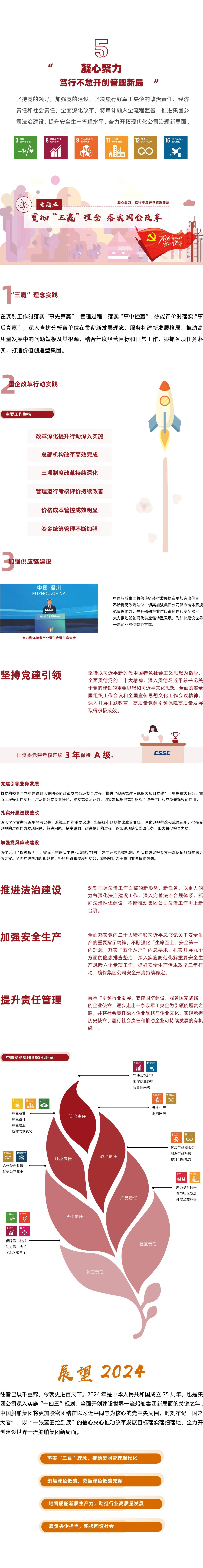 《報告》講述了中國船舶集團(tuán)貫徹新發(fā)展理念,堅持價值創(chuàng)造,發(fā)展壯大主業(yè)實業(yè),增強經(jīng)營管理能力,加快深化改革,建設(shè)世界一流船舶集團(tuán)的成績。主體章節(jié)圍繞“強軍勝戰(zhàn),乘風(fēng)破浪逐夢萬里海天”“向海圖強,披荊斬棘打造大國重器”“綠色發(fā)展,踐行低碳共建生態(tài)文明”“勇?lián)姑?,眾志成城奏響和諧樂章”“凝心聚力,篤行不怠開創(chuàng)管理新局”五個方面全面展示了中國船舶集團(tuán)履行政治責(zé)任、經(jīng)濟責(zé)任、環(huán)境責(zé)任、社會責(zé)任的實踐成效。