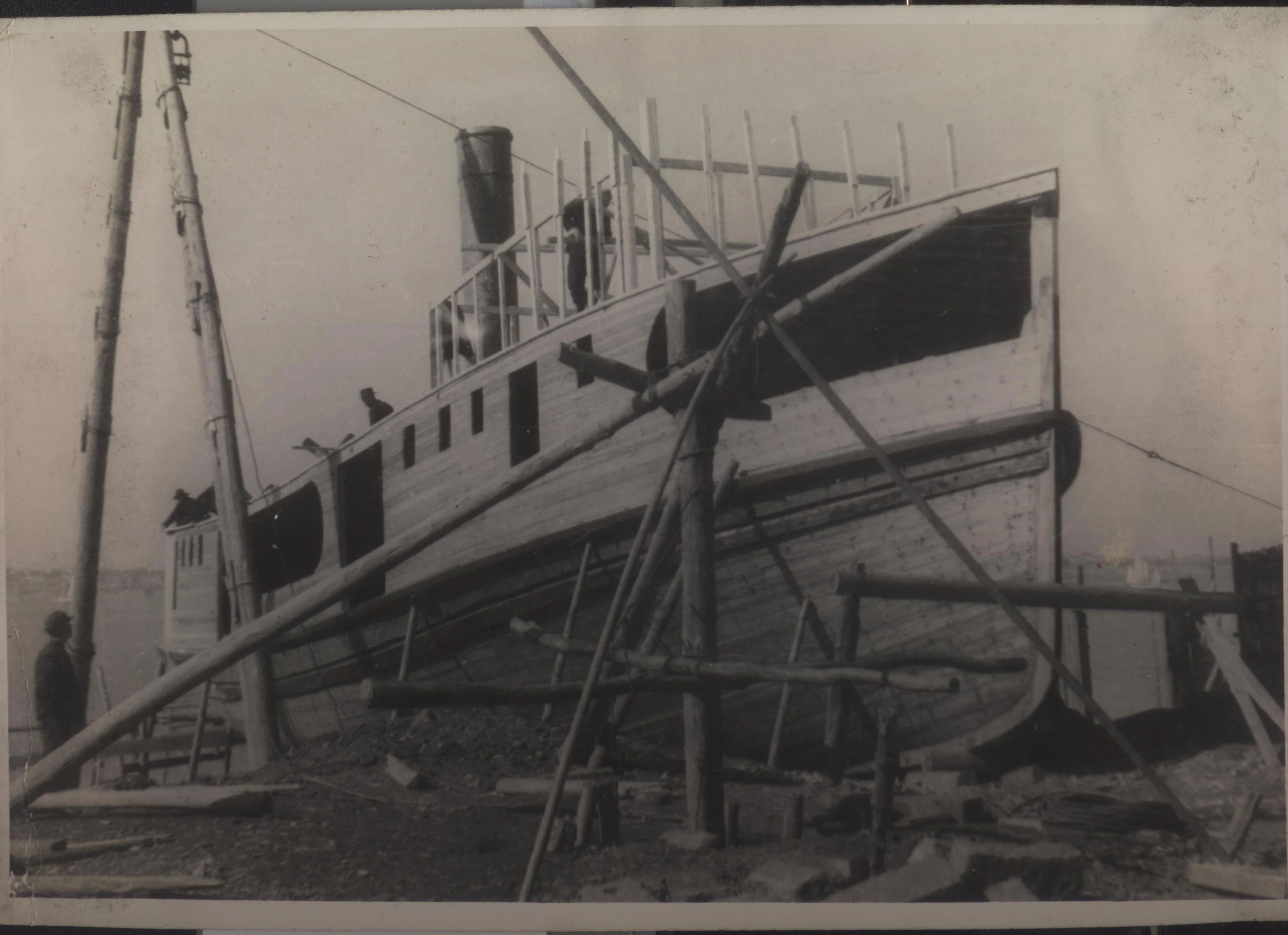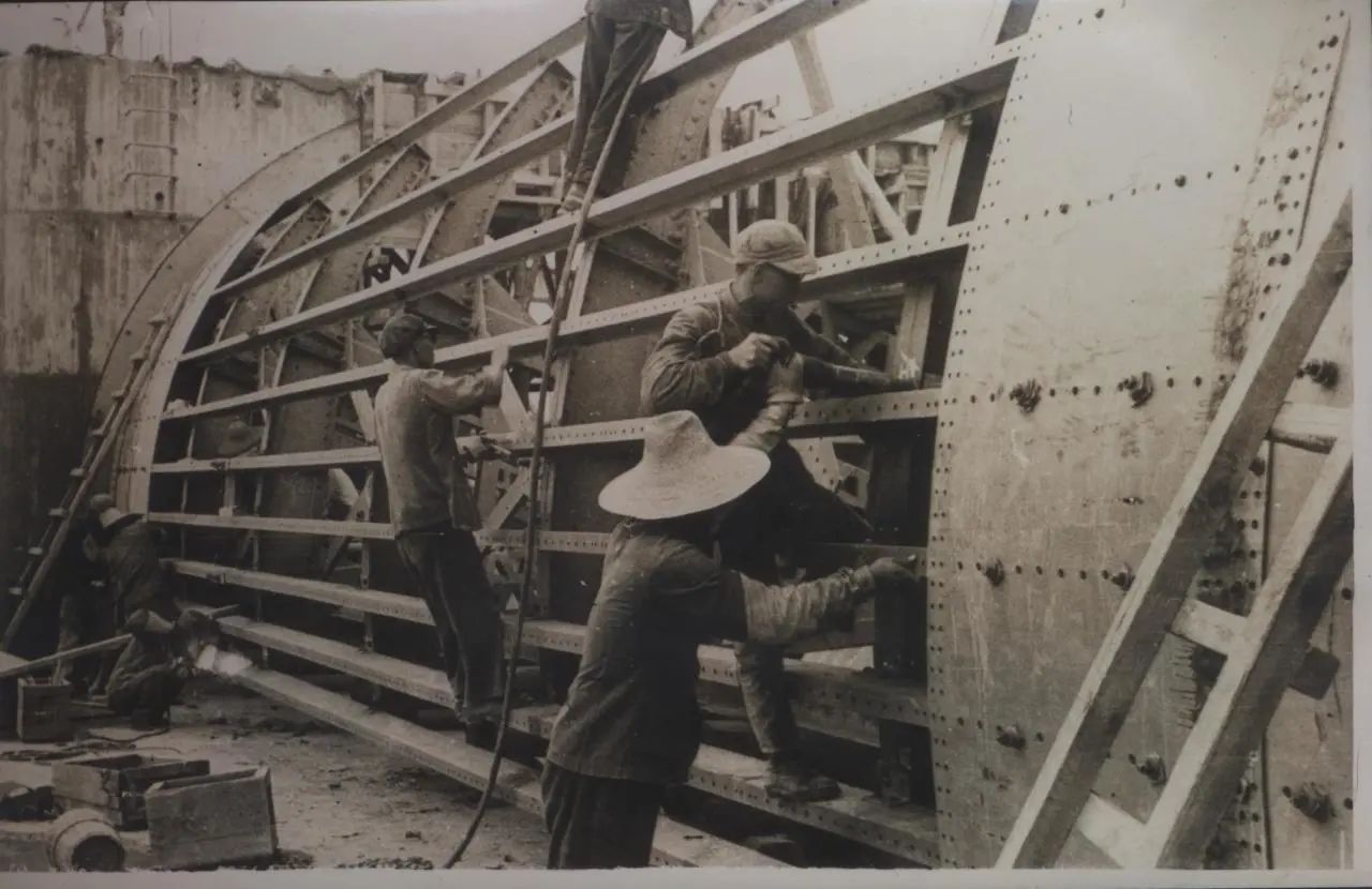 1934年武漢,上世紀30年代,武昌造船成立之初,工人們以手工作業(yè)“敲敲打打”形式開展修造船業(yè)務(wù)。修造的船只大多為100~300噸、鋼肋骨與木殼結(jié)構(gòu),僅有少量是鋼鉚接船體。建造的船只只能在長江上航行跑跑運輸。為了生存和救國,船廠還建造一些農(nóng)用機械器具、槍支,以輔助民生、支援抗日。