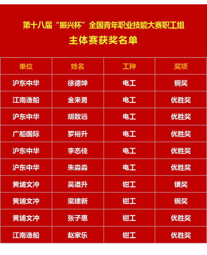 11月15日,第十八屆“振興杯”全國青年職業(yè)技能大賽職工組全國決賽在沈陽落下帷幕,中國船舶集團青年取得主體賽(職業(yè)技能競賽)“1銀2銅7優(yōu)勝獎”、專項賽(創(chuàng)新創(chuàng)效競賽)“1銀3銅4優(yōu)勝獎”的好成績。其中,黃埔文沖吳道升、七〇七所“低噪聲小型化長航時高精度激光慣導技術”項目分獲銀獎,在“青春競技場”上展現(xiàn)了船舶青年的自信卓越風采。