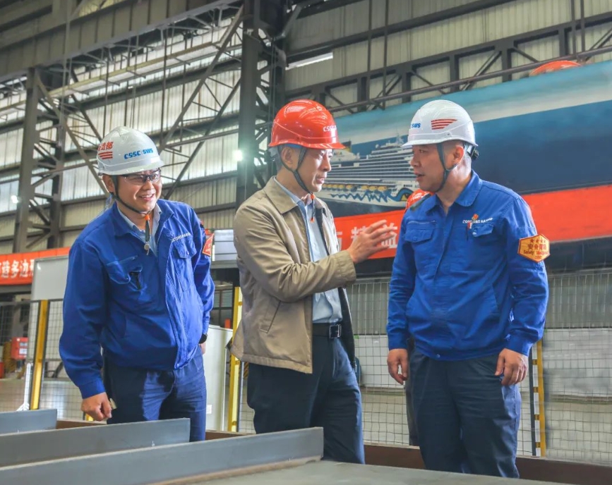 在相關(guān)二級管理單位,徐鵬調(diào)研了相關(guān)重點實驗室、車間和在建的國產(chǎn)大型郵輪“愛達·花城號”,與一線職工深入交流,并聽取了單位負責人關(guān)于經(jīng)營生產(chǎn)、公司治理、深化改革、隊伍建設、黨的建設等方面情況匯報。