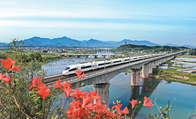 4月14日,一列動(dòng)車穿行“中國最美高鐵”合福線新安江休寧古城巖大橋。徐 明攝(人民視覺)