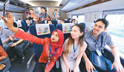 6月17日,100余名留學(xué)生從西安出發(fā),乘坐寶蘭高鐵試運(yùn)行動(dòng)車組前往蘭州,初次體驗(yàn)即將開通運(yùn)營的首條貫通新絲路高鐵。圖為幾名外國留學(xué)生在動(dòng)車組試驗(yàn)列車上自拍。唐振江攝(人民視覺)