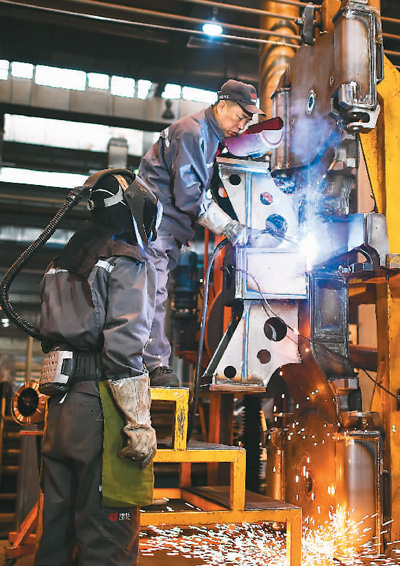 圖為四月二十三日,李萬君(右)在為徒弟示范焊接技巧。新華社記者 許 暢攝