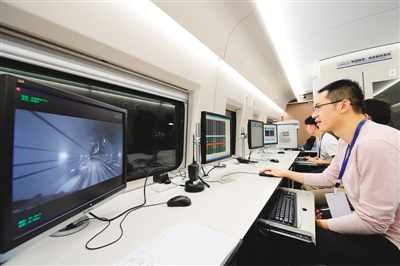 6月20日,西(安)成(都)高鐵陜西段聯(lián)調(diào)聯(lián)試正式啟動(dòng)。圖為當(dāng)高速綜合檢測列車穿越秦嶺時(shí),技術(shù)人員在監(jiān)測列車運(yùn)行數(shù)據(jù)。新華社記者 李一博攝