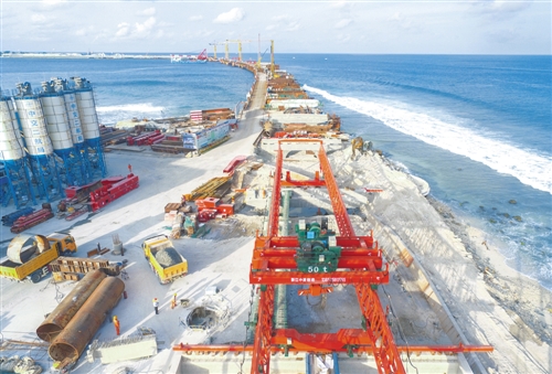 這是7月6日在馬爾代夫航拍的建設(shè)中的中馬友誼大橋。隨著主橋23號墩承臺最后一車混凝土的澆筑,中國援馬爾代夫中馬友誼大橋5個主橋承臺6日全部施工完成,標(biāo)志著占全橋施工總量約70%的主橋部分從此徹底擺脫印度洋的強(qiáng)涌浪襲擾,進(jìn)入上部結(jié)構(gòu)施工階段。