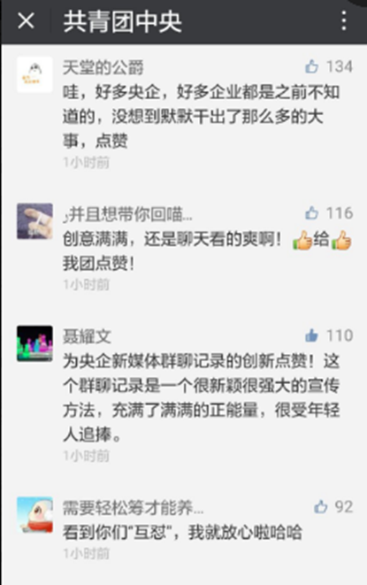據(jù)初步統(tǒng)計,截至10月23日18時,有關(guān)“央企新媒體群聊記錄”的媒體轉(zhuǎn)載報道共70余篇,391個微信公眾號、970多個微博參與報道,累計閱讀量超過千萬次。記者注意到,粉絲留言最多的是“要求入群”“現(xiàn)在才知道央企干了這么多”等。