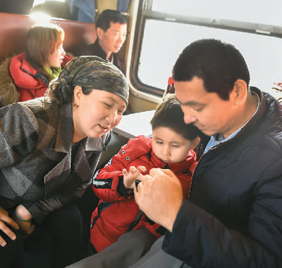 11月25日,在新疆塔克拉瑪干沙漠西南緣的喀什-和田對開火車“和田玉龍?zhí)枴鄙希每蛡冋谛菹?。(趙 戈 攝)