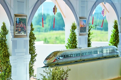 在開工儀式上展出的中國(guó)“復(fù)興號(hào)”高鐵列車模型。新華社發(fā)