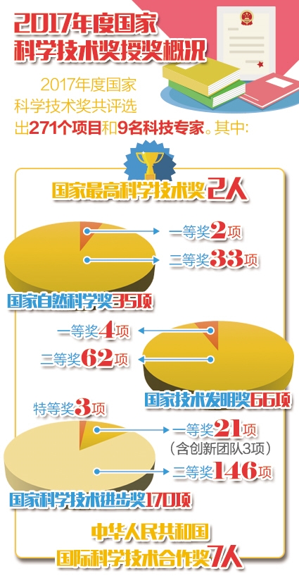 1月8日,2017年度國家科學技術獎勵大會在北京人民大會堂隆重舉行。2名科學家獲得國家最高科學技術獎,271個項目獲得國家自然科學獎、國家技術發(fā)明獎、國家科學技術進步獎三大獎,7名外籍專家獲得國際合作獎。