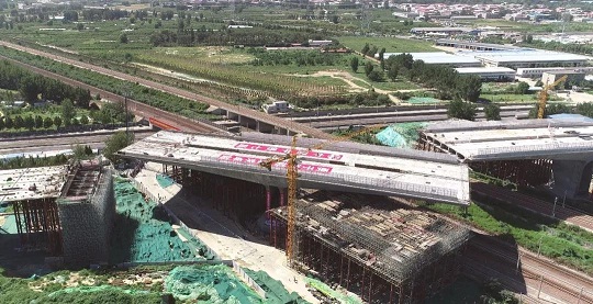 ????該工程上跨鄭焦城際、京廣鐵路等3條線5股道,每天有140對(duì)高鐵列車和貨運(yùn)列車擦肩而過,轉(zhuǎn)體橋與鐵路線的最近距離只有8.7米,加上該工程橋梁全長317米,寬38.7米,轉(zhuǎn)體懸臂長71.75米,單側(cè)轉(zhuǎn)體橋梁重達(dá)3萬噸,鐵路東、西兩側(cè)轉(zhuǎn)體橋梁總重達(dá)6萬噸,體量大,風(fēng)險(xiǎn)高,施工難度可想而知。為確??傊亓窟_(dá)6萬噸的轉(zhuǎn)體橋精準(zhǔn)對(duì)接,重點(diǎn)在于球鉸的制作、安裝,轉(zhuǎn)體過程中應(yīng)力應(yīng)變、位移與線性的實(shí)時(shí)監(jiān)測(cè)。本次成功應(yīng)用的轉(zhuǎn)動(dòng)體系采用鋼球鉸,由雙瑞特裝設(shè)計(jì)、制造、安裝及轉(zhuǎn)體施工,解決了大噸位橋梁轉(zhuǎn)體裝置超大承載力,靈活轉(zhuǎn)動(dòng)的難題。