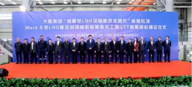 ????2019年11月26日,大船集團(tuán)舉行“薄膜型LNG運(yùn)輸船技術(shù)研究”科研專(zhuān)項(xiàng)MarkⅢ型LNG船全封閉模擬艙建造完工暨GTT和船級(jí)社頒證儀式。法國(guó)GTT公司、英國(guó)勞式船級(jí)社和中國(guó)船級(jí)社代表在模擬艙建造現(xiàn)場(chǎng)向大船集團(tuán)代表頒發(fā)證書(shū)。