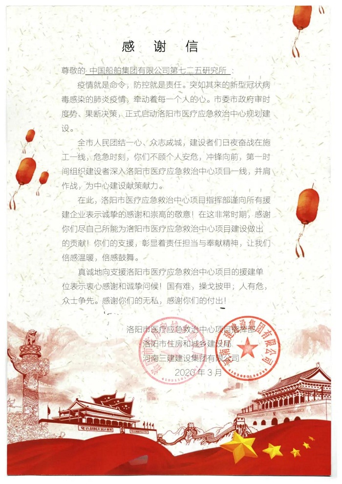 ????近日,中國船舶集團(tuán)七二五所收到洛陽市醫(yī)療應(yīng)急救治中心項(xiàng)目指揮部發(fā)來的感謝信,中國船舶集團(tuán)旗下江蘇自動(dòng)化研究所向英國合作單位寄送慰問函與防疫物資。洛陽市醫(yī)療應(yīng)急救治中心項(xiàng)目指揮部,對(duì)七二五所在新冠肺炎疫情期間支援建設(shè),洛陽市醫(yī)療應(yīng)急救治中心項(xiàng)目建設(shè)作出的貢獻(xiàn)表示感謝。