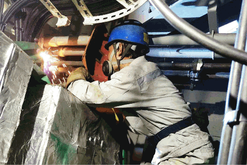 為保證臺(tái)風(fēng)來臨前能夠進(jìn)入錨地安全拋錨,大連公司海工公司員工戰(zhàn)高溫?fù)尮?jié)點(diǎn),狹小的空間里進(jìn)行焊接作業(yè)。