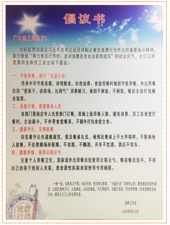 連日來,中國船舶集團(tuán)多家成員單位積極踐行習(xí)近平總書記對制止餐飲浪費(fèi)行為的重要指示精神,進(jìn)一步加強(qiáng)宣傳教育,培養(yǎng)節(jié)約習(xí)慣。首先刊載有特色的宣傳海報、條幅,