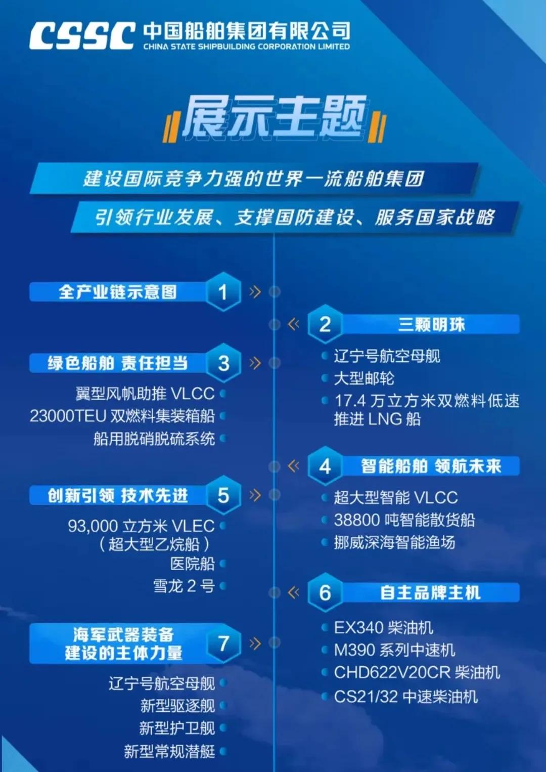 總體展區(qū) 中國船舶集團(tuán)展示了代表著世界造船工業(yè)最高水平的航空母艦、大型郵輪、液化天然氣(LNG)船“皇冠上的三顆明珠”,充分彰顯具備設(shè)計(jì)建造符合全球船級社規(guī)范、滿足國際通用技術(shù)標(biāo)準(zhǔn)和安全公約要求的產(chǎn)品的能力。圍繞“綠色 智能 創(chuàng)新”主題,特別設(shè)置了3個(gè)主題展臺,重點(diǎn)展示23000TEU雙燃料集裝箱船、超大型智能超大型油船(VLCC)、挪威深海智能漁場、9.8萬立方米超大型乙烷運(yùn)輸船(VLEC)、“雪龍2”號等9型產(chǎn)品,彰顯出中國船舶集團(tuán)貫徹落實(shí)“創(chuàng)新、協(xié)調(diào)、綠色、開放、共享”新發(fā)展理念的實(shí)踐。