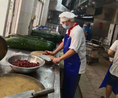 而在技校和養(yǎng)老院的后廚,阮積劍等廚師們同樣已經(jīng)整裝待發(fā)。在社區(qū)封閉初期,飲食服務部養(yǎng)老院飯?zhí)脝T工由原來的18人劇減至7人。廚師梁志寬面對每日約800人的進餐人數(shù),迎難而上,轉變菜式花樣,合理優(yōu)化膳食,注重營養(yǎng)搭配,以嫻熟的廚藝獨自完成后廚大量工作,保證了菜肴準時出品。而廚師、黨員陳兆銘得知飯?zhí)靡蚴芤咔橛绊懚耸謬乐夭蛔?,在試航歸來做完核酸檢測后立即回到養(yǎng)老院飯?zhí)玫膷徫簧稀榇?,他直接把“家”安在了養(yǎng)老院,每天睡在簡易折疊床上。