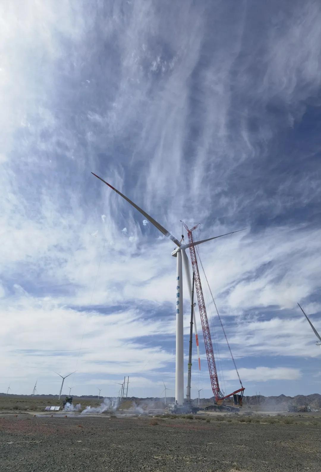 該項目于4月12日啟動首臺機(jī)組吊裝,中國海裝項目人員提前制訂吊裝調(diào)試方案及安全預(yù)案,采取“邊吊裝邊調(diào)試”的方式加快整體工程進(jìn)度,克服戈壁灘高溫天氣和疫情反復(fù)等困難,于7月10日實現(xiàn)首批100MW實現(xiàn)全容量并網(wǎng),8月20日實現(xiàn)59臺機(jī)組全部吊裝。
