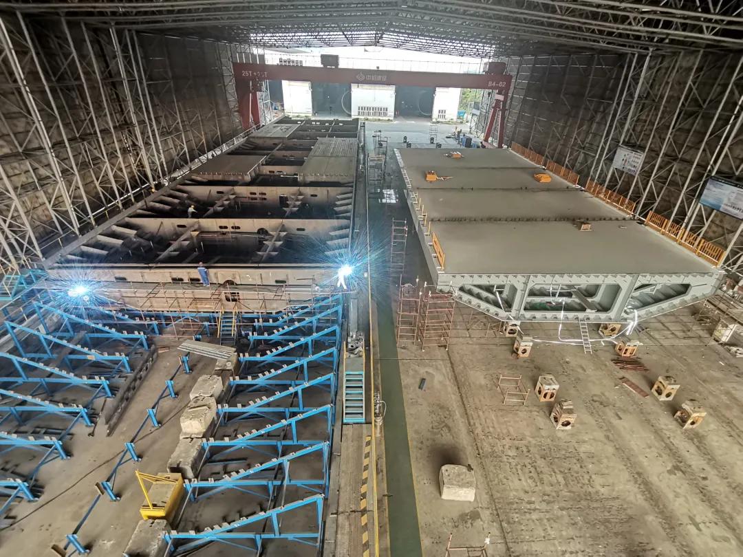 同樣承擔(dān)了深中通道隧道沉管鋼殼制造任務(wù)的中國(guó)船舶集團(tuán)旗下廣船國(guó)際,近日剛剛完成了E15管節(jié)鋼殼的過駁交付。E16鋼殼計(jì)劃在9月底前進(jìn)行聯(lián)合驗(yàn)收;E17鋼殼則正在進(jìn)行大節(jié)段總組。
