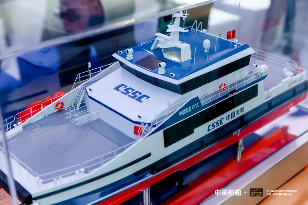 在本屆風(fēng)能大會上,中國海裝與遠舟科技聯(lián)合設(shè)計制造的國內(nèi)首艘30米級專業(yè)風(fēng)電運維船發(fā)布。投運后,該船將與中船海工101海上風(fēng)電安裝平臺一道,為海上運維“保駕護航”。