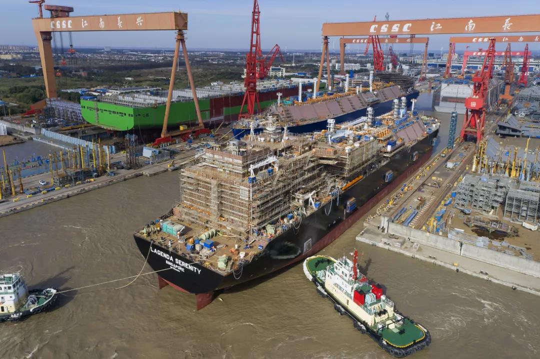 11月23日,滬東中華2號船塢內(nèi)一艘174000立方米LNG船、一艘79960立方米LNG船、半艘174000立方米LNG船實現(xiàn)3船起浮、2船出塢,這也是滬東中華歷史上首次實現(xiàn)2艘LNG整船同塢同日下水。