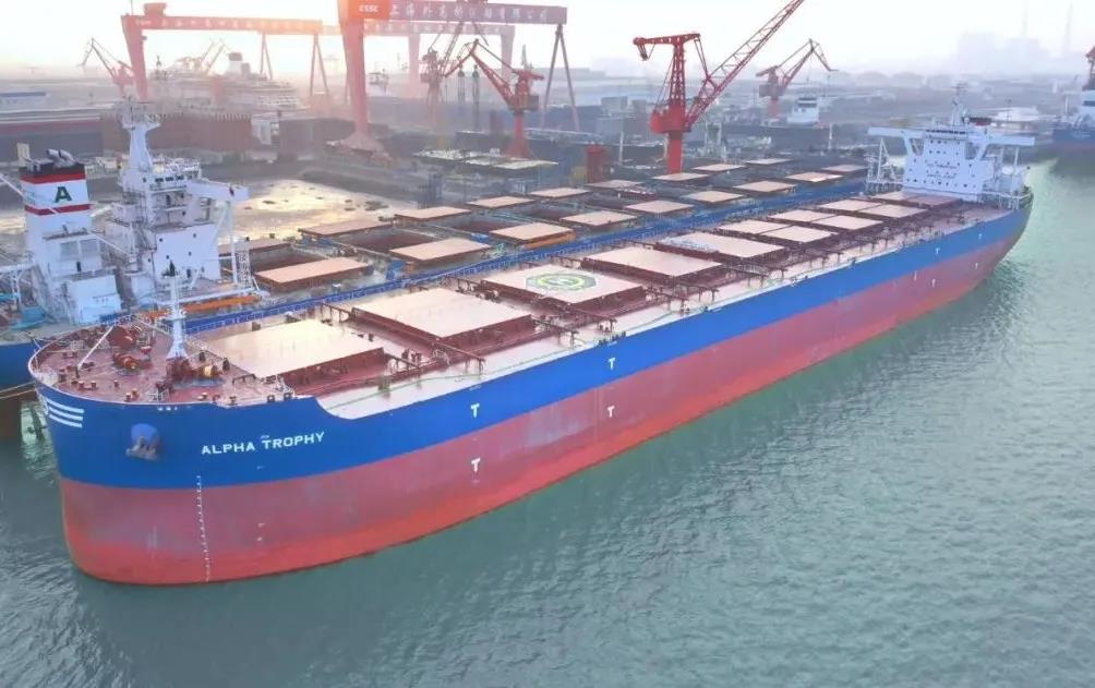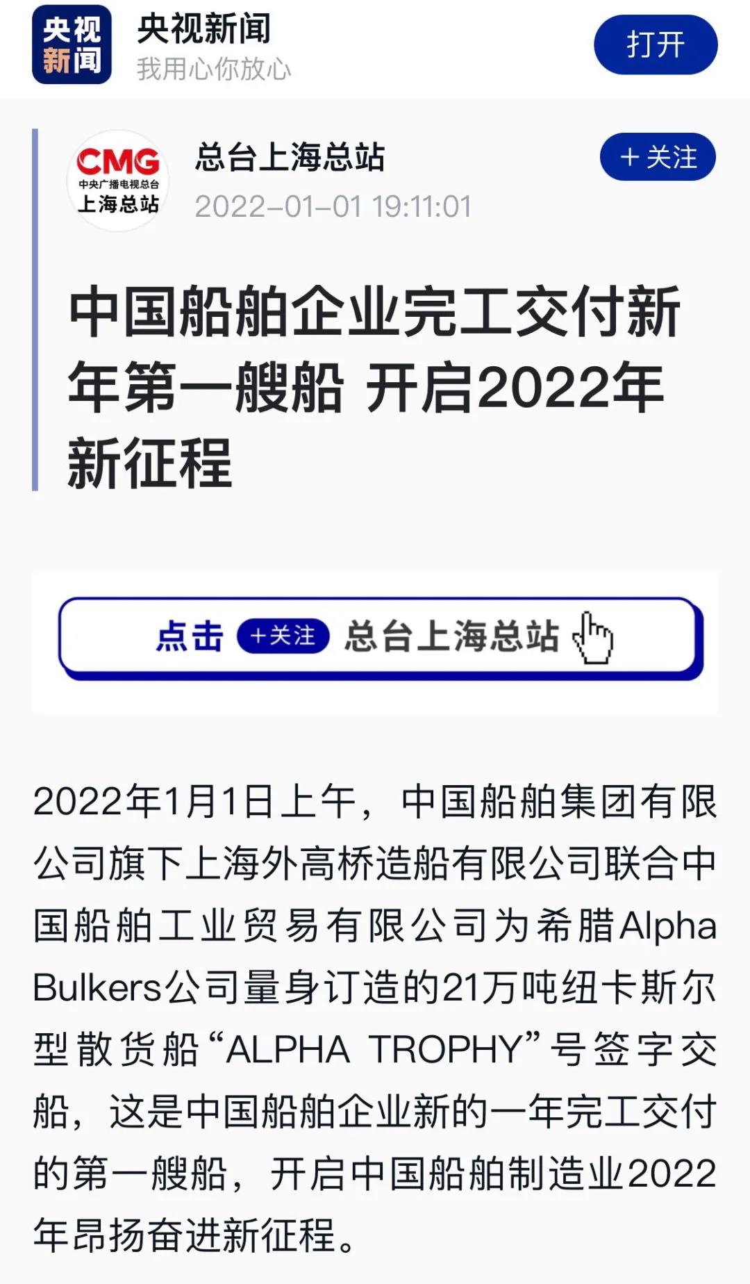 1月1日上午,中國(guó)船舶集團(tuán)旗下外高橋造船聯(lián)合中船貿(mào)易建造的21萬噸紐卡斯?fàn)栃蜕⒇洿癆LPHA TROPHY”號(hào)簽字交船,這是中國(guó)船舶企業(yè)新的一年完工交付的第一艘船,開啟中國(guó)船舶制造業(yè)2022年昂揚(yáng)奮進(jìn)新征程。