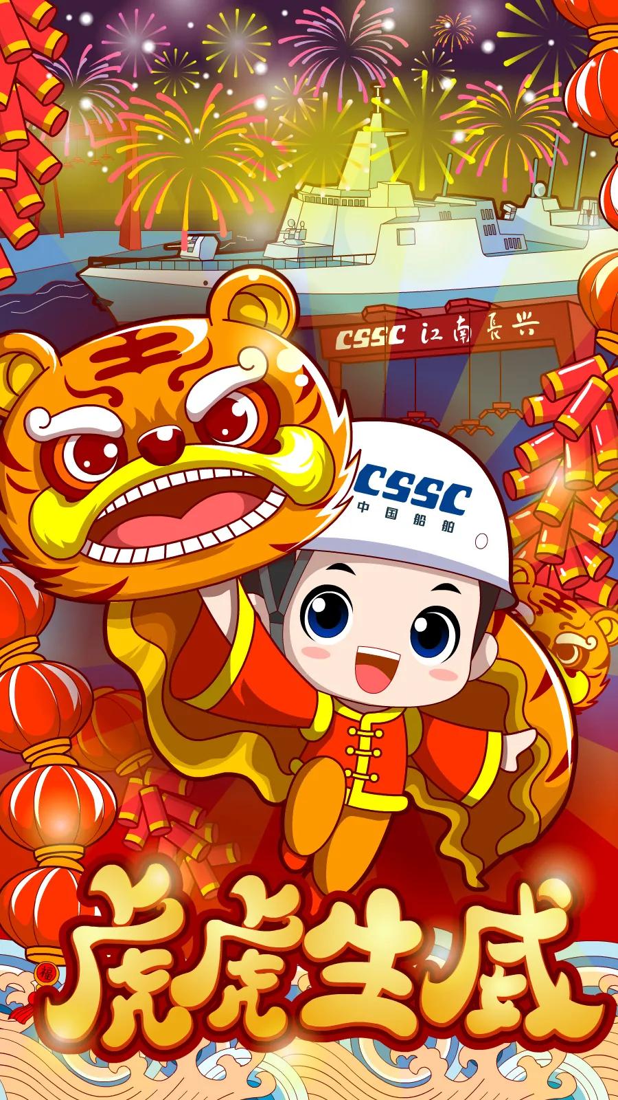海報(bào)采用國潮畫風(fēng),中間部分“江小南”穿著新衣舉著虎頭,寓意新的一年中國船舶人虎虎生威,上面部分以重要產(chǎn)品和廠區(qū)設(shè)備為主,詮釋江南造船建造國之重器的初心和使命,同時(shí)輔以鞭炮、煙花、燈籠等新年元素,使海報(bào)充滿喜慶祥和的新年氛圍。